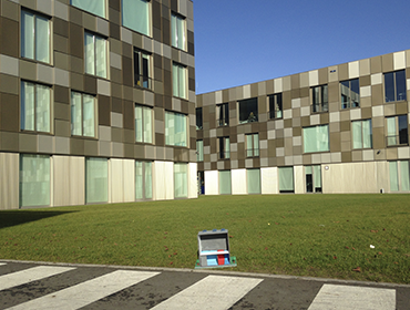 Zonnepaneeltjes in de ramen die ook als zonnewering kunnen worden gebruikt: Er zitten kleine zwarte bolletjes in de ramen die de warmte absorberen en omzetten in bruikbare energie, daarnaast wordt het ook als zonnewering gebruikt.