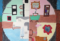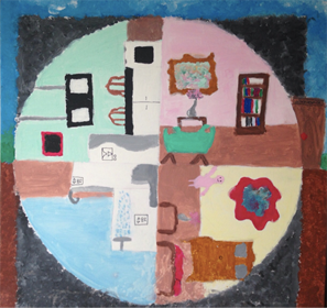 Wij Jasmijn, Bente en Jodie hebben voor ons werkstuk een schilderij gemaakt. In dit schilderij zie je een draaiend huis, deze wordt bestuurd door de mechanismes in de hoeken van het huis. Als je op de rode knop drukt bij de deur, gaat het huis draaien. Je kunt in andere kamer zitten doordat er zwaartekracht is die iedereen op de grond houdt. De ene helft van het huis zit onder de grond, dit neemt minder ruimte in. Zo kunnen er ook meer mensen op de aarde wonen.